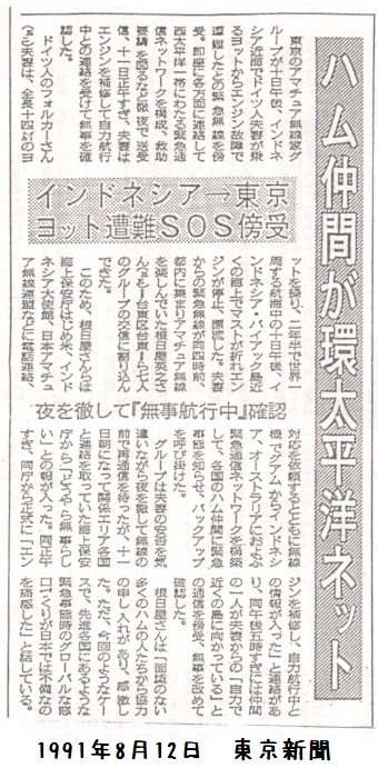 開局してから20年経った1991年8月に、ドイツ人夫婦が乗っていたヨットがインドネシア近海で漂流し、アマチュア無線で助けを求める「SOS」の電波を受信しました。 私は、そのドイツ人夫婦を救出するための 緊急通信ネットワーク を環太平洋のアマチュア無線家と立ち上げ、人命を救助する貴重な体験をしました。当時の私のアマチュア無線による人命救助活動については、新聞、日本アマチュア無線連盟(JARL)の会報、アマチュア無線雑誌などに取り上げられました。