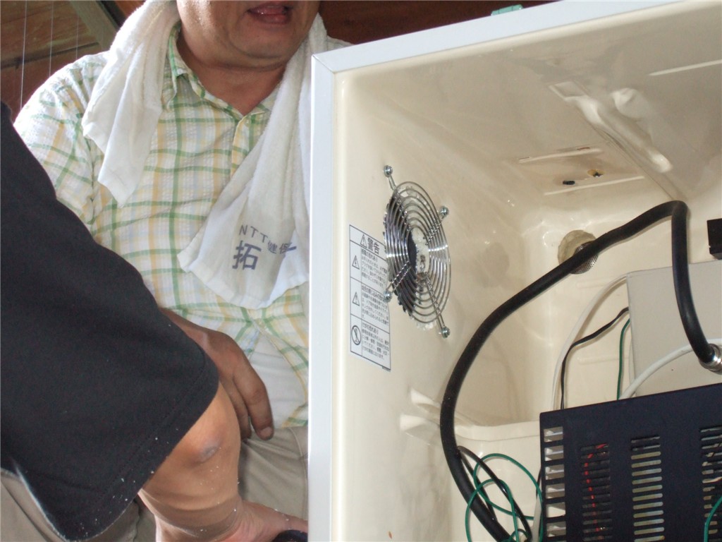 収納している冷蔵庫の風通しを良くするため大型FANの取り付けと外気取り入れの穴を開けました。無線機とTNCは、修理調整を行い設置しました。当初は、1Passで周辺のゲート局が受信する物と想定していましたが不可能でした。設置の場所が山の反対側だったりして障害があるようです。今後の検討が必要です。