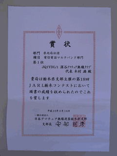 ![]() JQ1YDL 第18回栃木コンテスト県内社団マルチバンド第1位 |