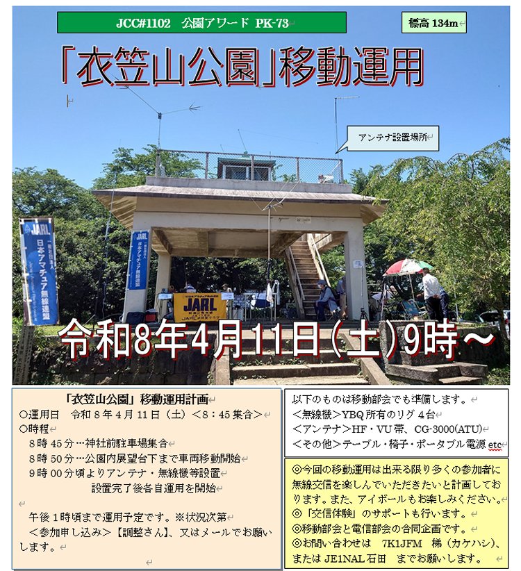 | 令和8年4月11日(土) 「衣笠山公園」で移動運用を行います。 |