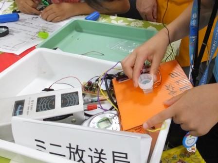 昨年に引続きAMラジオに取組みました。今回は同調回路にポリバリコンを使い、PETボトルキャップをダイヤルにして選局操作が大幅に改善されました。 「お母さん、ラジオが聞こえるよ!」と子供がイヤホンを差出すと、「本当に聞こえるのね!」とお母さんも驚いていました。大人も子供も同時に感動させることができる、ラジオにはそんな力があります。 <協力:野老実験クラブ>