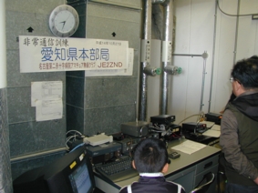 8時に当院シャックに集合した。当日は快晴に恵まれたが屋上は強風で寒かった。JG2GFX種村・愛知県支部長の激励挨拶の後、JA2DEX柴田OMから訓練概略の説明を聞き、ぶっつけ本番で開始した。JE2ZND部員は、午前9時から本部局のある当院屋上無線室より各地のサブ基地局と交信をしたり地区サポート局を手伝った。また1291.78MHz八事レピータを利用しレピータ利用サブ基地局を運用した。その後、JARL愛知県支部役員(JG2GFX種村・愛知県支部長ほかJA2CME、JA2LUH、JE2VMB、JA2DEX)が見守る中、本部局を運用した。