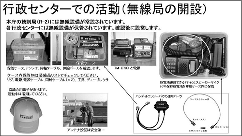 統制局と会員の行動 ③どのように行動したらいいでしょうか? ④行政センターに到着したら 近隣の行政センターについたら、当協議会の会員である旨を市職員に告げ、指示に従ってください。協議会用帽子がありますので活動中は着用してください。 役員は腕章、ベスト、帽子、(状況に応じてヘルメット)を着用し出向きます。 統制局と会員の行動:pdfファイル