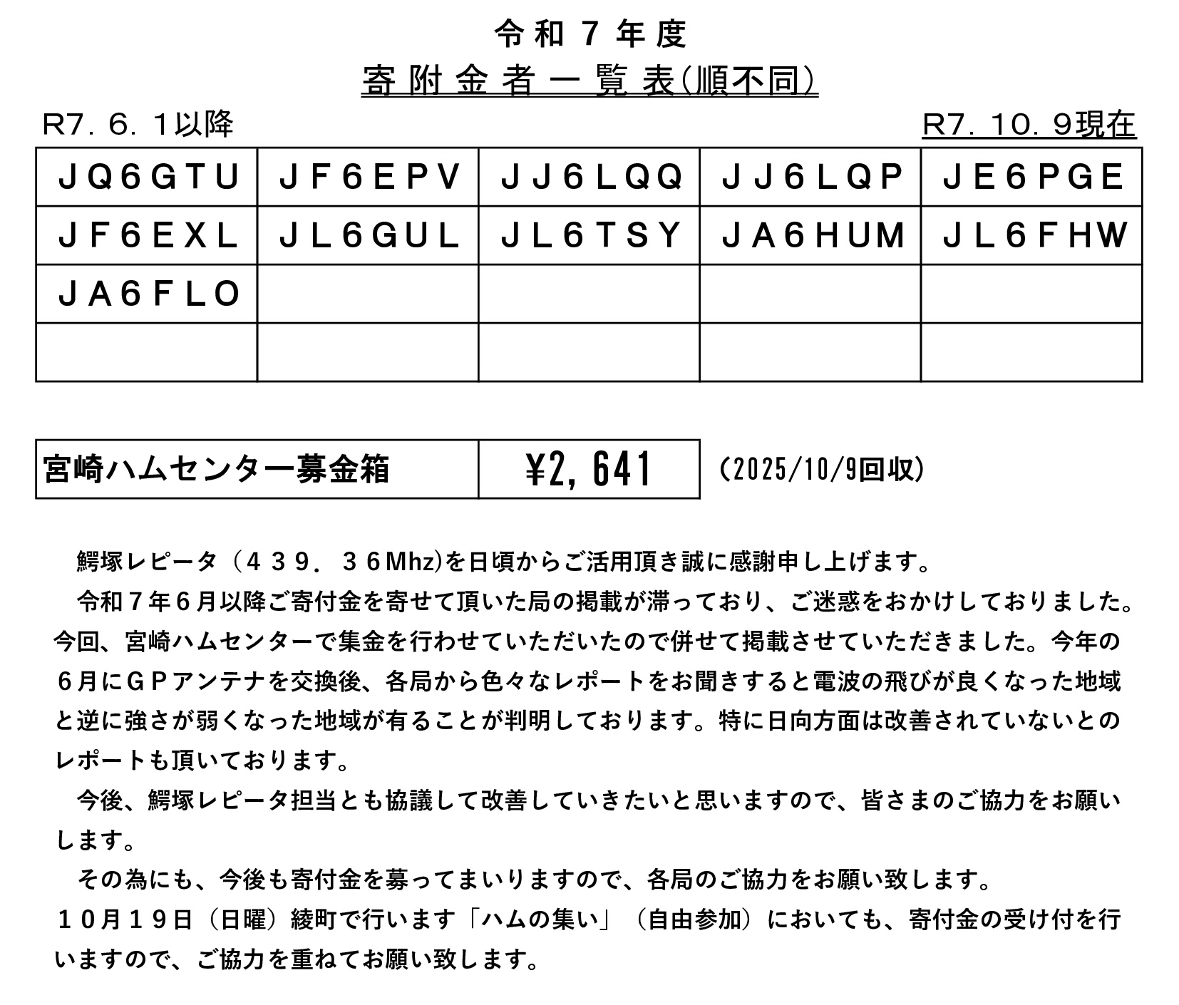 今回、寄付を呼びかけたところ、早速、銀行口座への振込や宮崎ハムセンター及び原口無線各所で寄付を頂きました。また、5月18日都城市金御岳で行われました「みやざき2mSSB愛好会」主催のアイボールミーティングに於いても沢山の局に寄付して頂き感謝申し上げます。 今後も、引き続き募集を行っていますので、各局の多数の善意をお願いします。 寄付金者は随時ホームページにアップさせて頂きます。