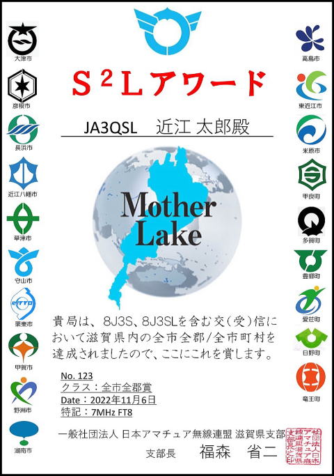 | 全市全郡賞 | 8J3S、8J3SLを含む交信で滋賀県内の全市全郡と交信する。 ただし、13市 + 3郡 = 16中の11以上は記念局とすること。 |