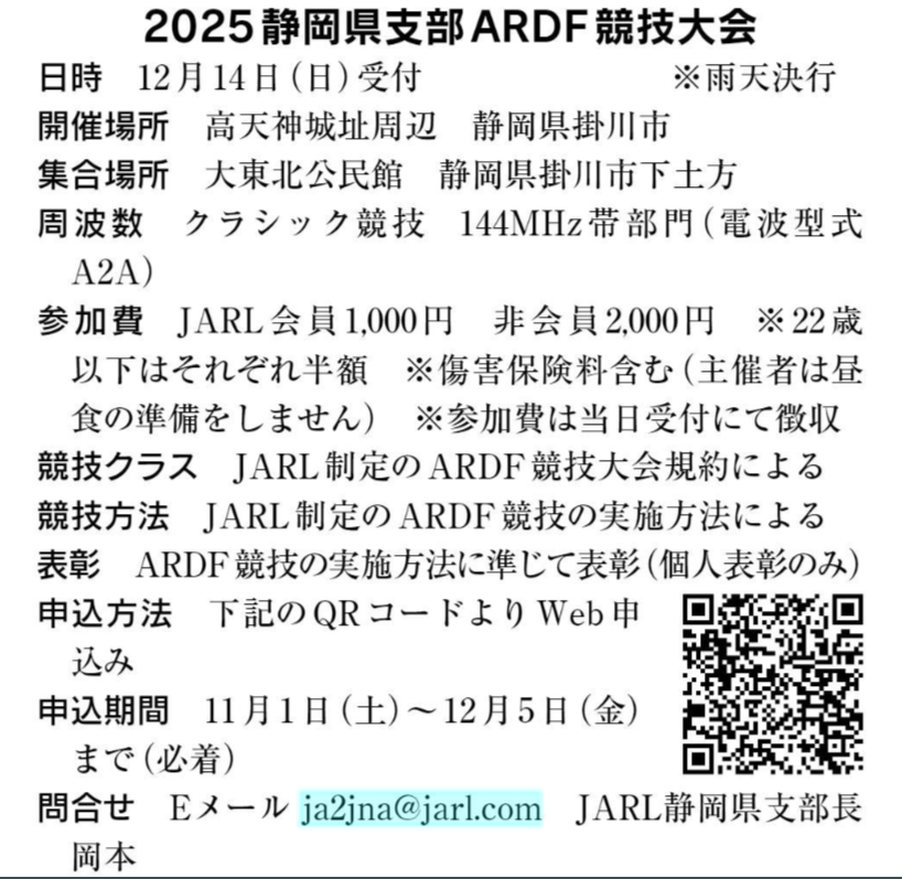 | JARL静岡県支部ではARDFの取り組みとして、 静岡県支部ARDF競技大会兼静岡県高等学校ARDF 競技大会を開催しています。 ■令和7年12月14日(日)に開催した、2025静岡県 支部ARDF競技大会兼 静岡県高等学校ARDF競技 秋季県大会は無事終了しました。 |