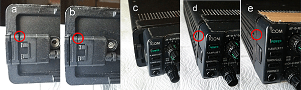 これらの接続コネクタにはスプリングコンタクトピン構造が採用されており、このコンタクト面が汚れたり(汚れによるコンタクトピンのスライド動作不良も含む)、そのストロークが小さいために互いのコネクターの位置決めが甘くなる事(長期間に何回もの抜き差しの結果)などが原因で した。 下写真で、a:専用ケーブを挿したままの状態(1mm強の隙間が出来、この状態では動作しません)、b:それを押し込んでネジで位置多決めした状態(ようやく動作)、c:直結の際に本体とパネルを合せた始めた状態、d:ロックが利くまで合わせた状態(約1mm近く位置ずれを起こし、動作不良が多い)、e:仕方なくガムテープでズレを補正した状態です。